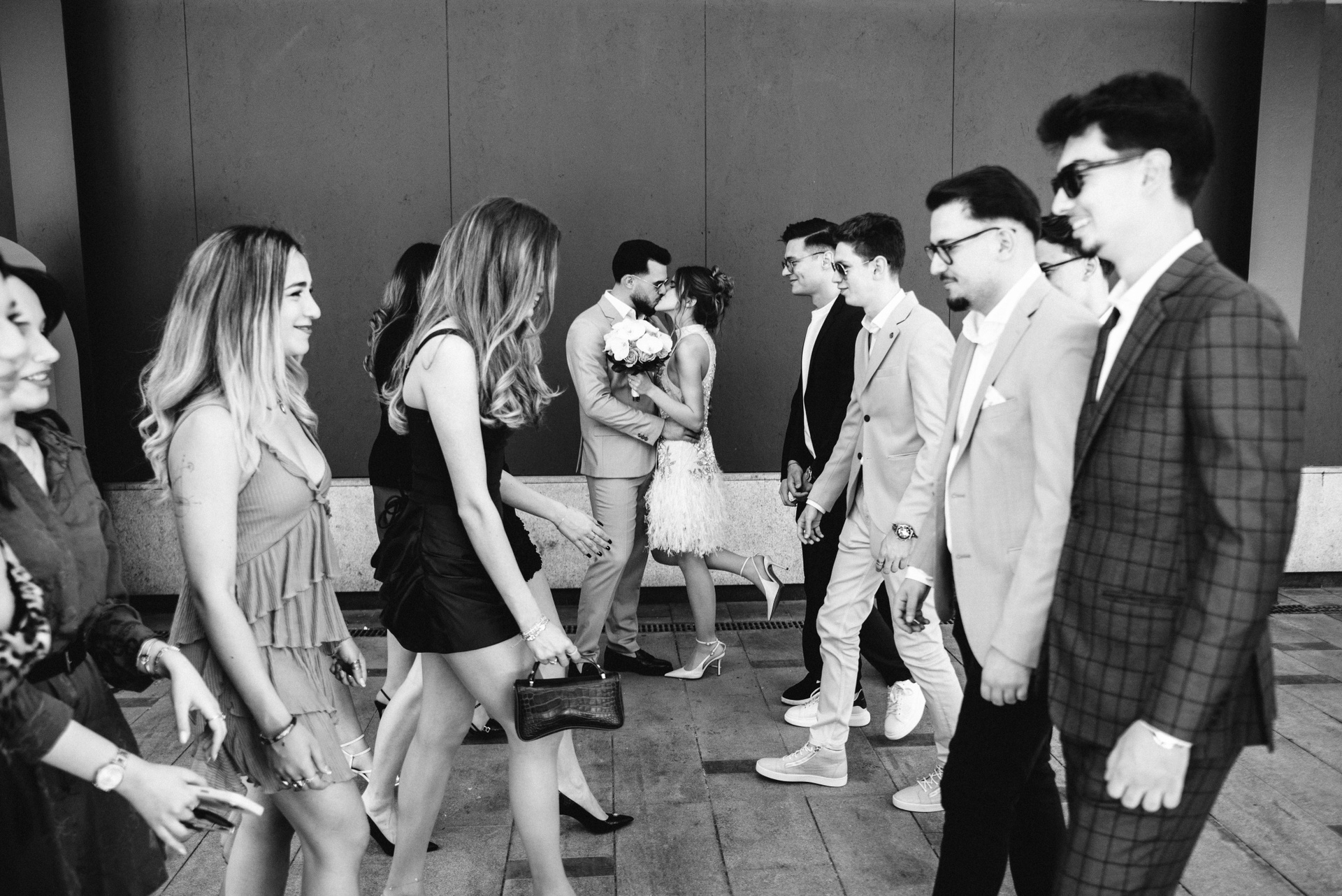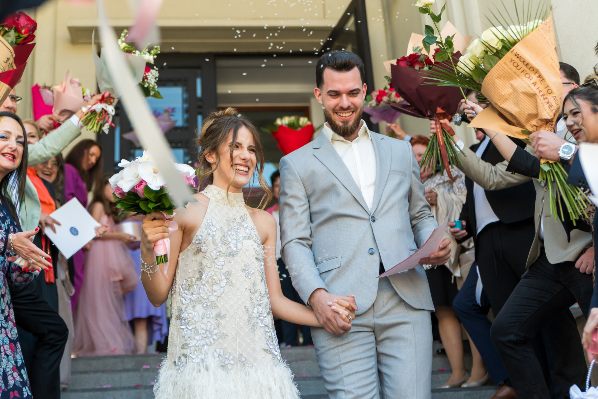 Soarele ne-a răsfățat cu o lumină caldă, ideală pentru a surprinde detaliile rochiei  și zâmbetetele relaxate, toți invitații radiau de veselie, flori peste tot, mai greu să ne găsim care cu cine este. Un moment cu totul special a fost prezența zecilor de porumbei din Piața Amzei, care au creat un cadru dinamic și plin de viață în cîteva fotografii, se vede că sunt obișnuiți cu oamenii.